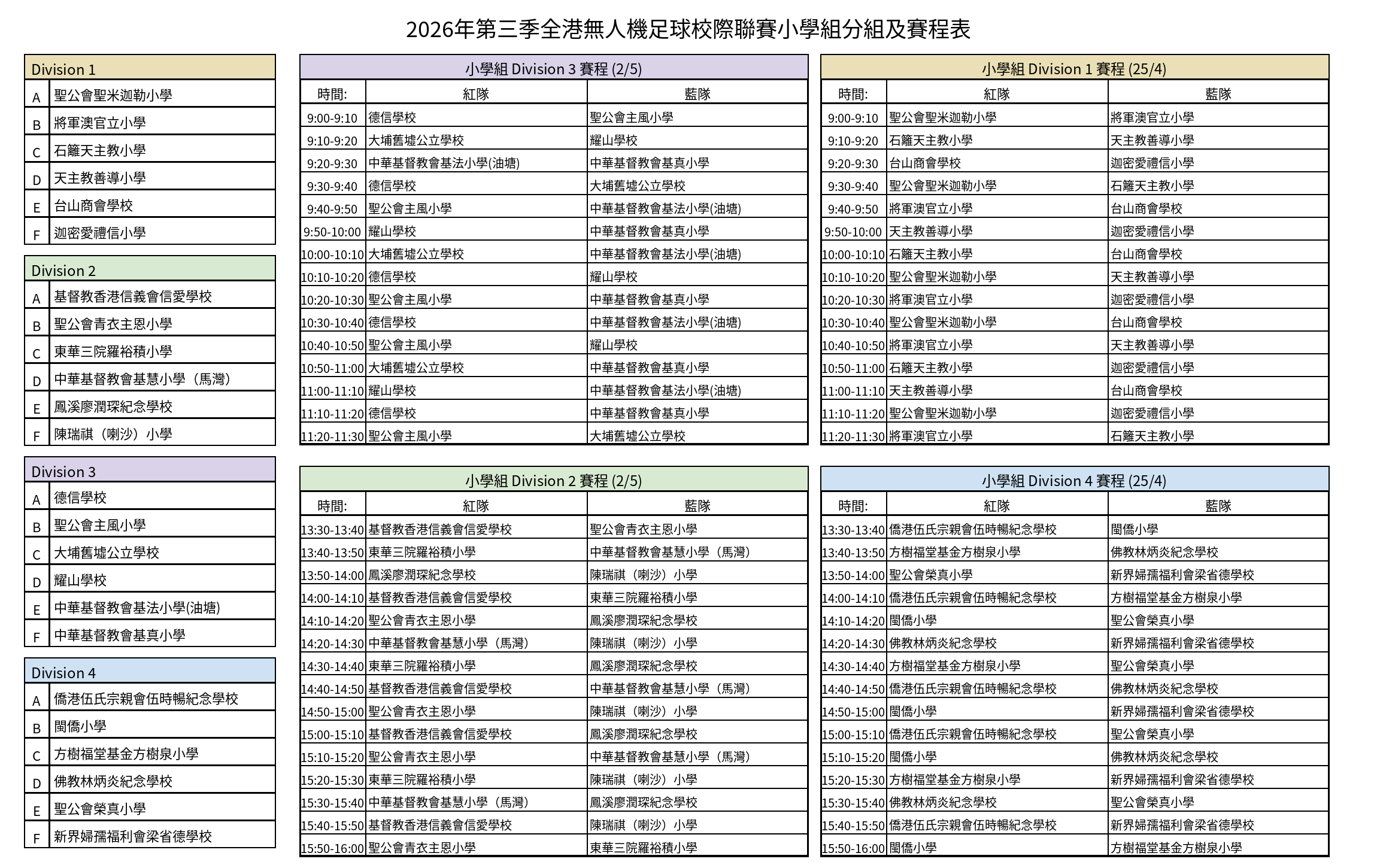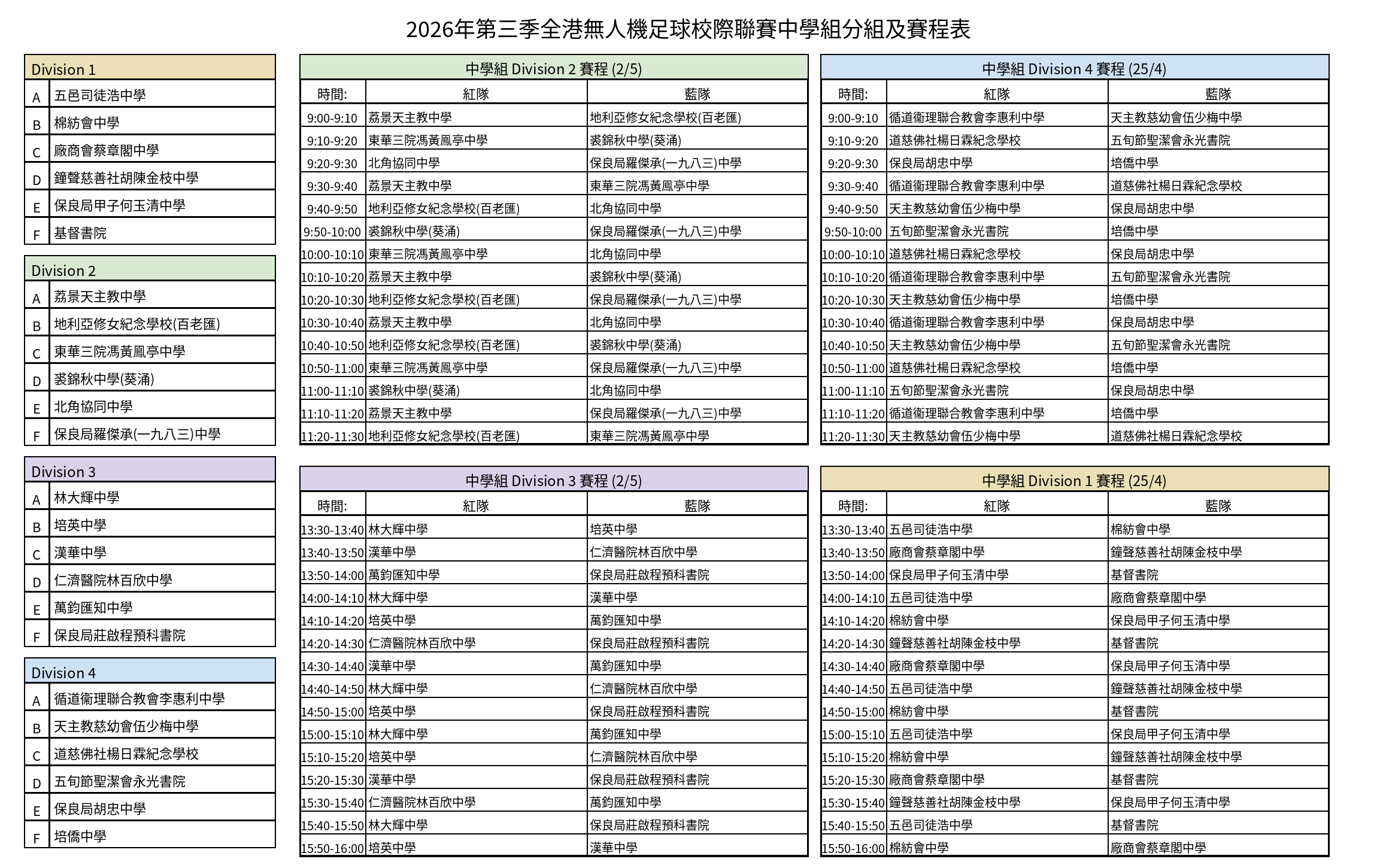 全港無人機足球校際聯賽分組及賽程表